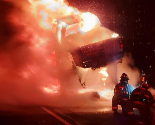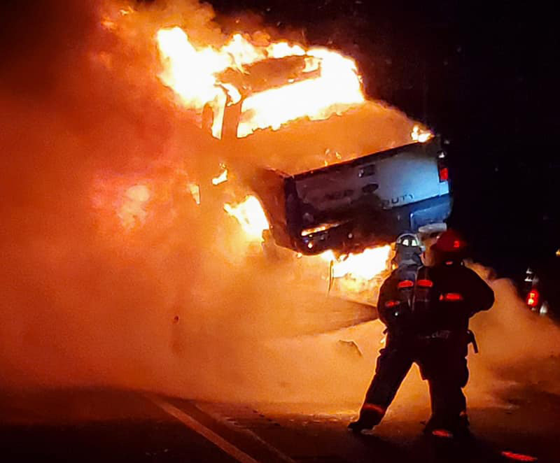 Dramatic Photos Show Firefighters Battling Car Hauler Fire On I-10