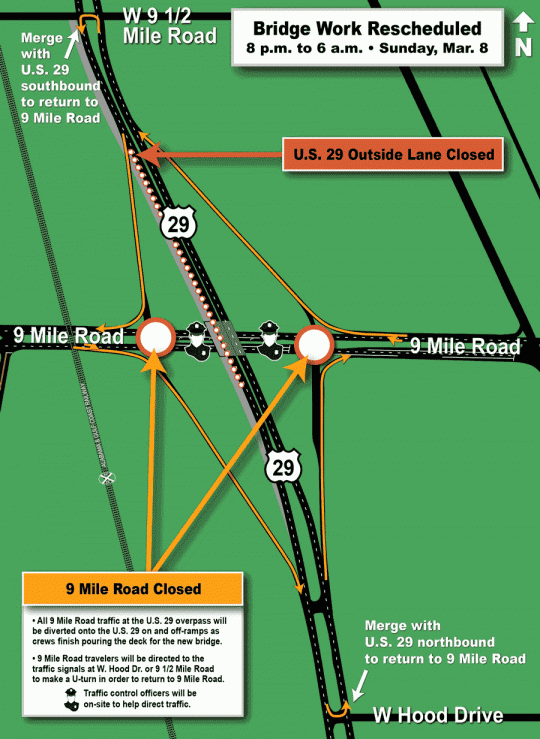 - Nine Mile Road: All traffic will be directed to the on and off-ramps at the U.S. 29 overpass. Traffic control officers will be on site to help direct motorists. The following detour will be in place: