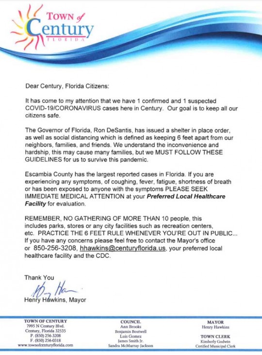 Both of the mayor’s letters opened with a statement that “we have 1 confirmed and 1 suspected” COVID-19 case “here in Century”. The Florida Department of Health has not, and will not, confirm the exact location of the one case that has been reported in the 32535 Century zip code. The Century zip code reaches some 15 plus miles from Highway 97 in Davisville east through Century to Escambia River.