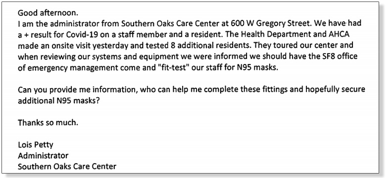 Through emails obtained through public records requests made independently by NorthEscambia.com and Rick Outzen of RicksBlog.biz, we have learned that on April 7, Southern Oaks Care Center Administrator Lois Petty emailed Escambia County Emergency Manager Eric Gilmore that a staff member and a resident had tested positive for COVID-19 (see email below). She said the health department and the Florida Agency for Health Care Administration had visited the facility on West Gregory Street in Pensacola on the previous day and tested eight additional residents.