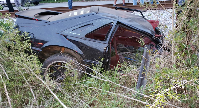 Witnesses on scene told the the Florida Highway Patrol trooper that the black Mustang that crashed may have been racing an older model blue Mustang that was last seen traveling south on Pauline Street. The blue Mustang was described as a mid-90s fastback or “fox body” driven by a white male. The vehicle had a black carbon fiber hood.