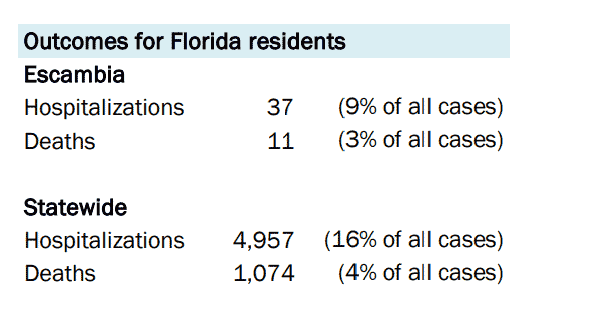 Escambia County cases were up 15 to 457 and, and Santa Rosa was up two to 149. There have been 11 deaths in Escambia County, with eight of those in long-term care facilities. Santa Rosa County has had six deaths with none in long-term care centers.