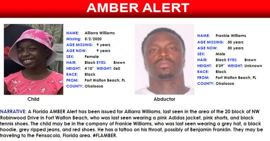 Alliarra Williams, last seen in the area of the 20 block of NW Robinwood Drive in Fort Walton Beach. She was last seen wearing a pink Adidas jacket, pink shorts, and black tennis shoes. The child may be in the company of 30-year old Frankie Williams, who was last seen wearing a grey hat, a black hoodie, grey ripped jeans, and red shoes. He has a tattoo on his throat, possibly of Benjamin Franklin.