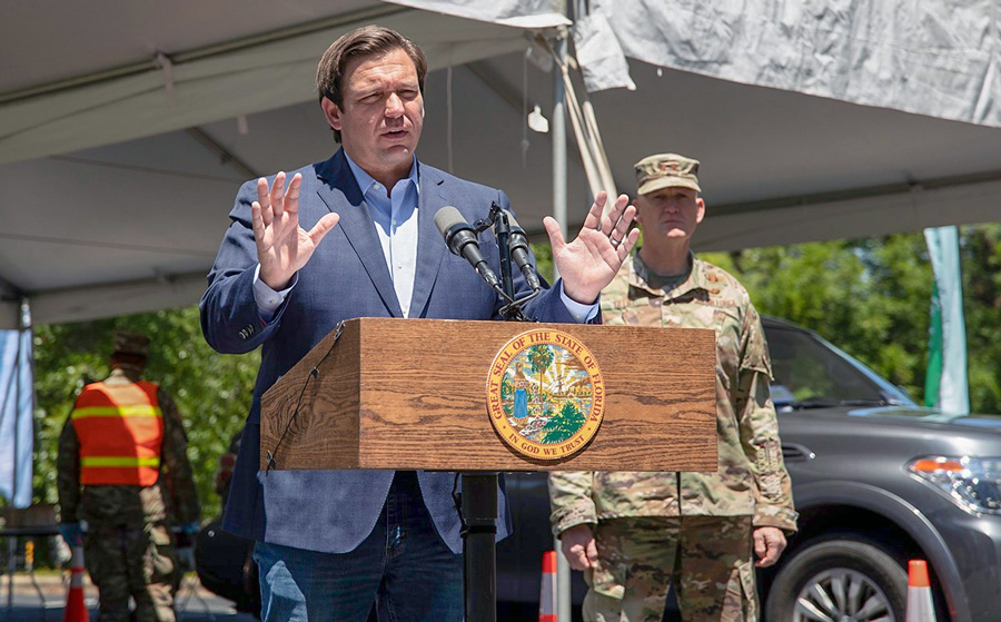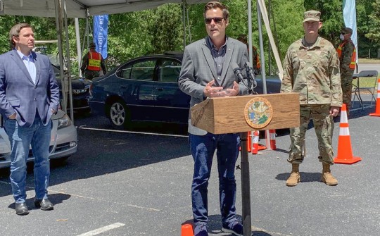 DeSantis and Rep. U.S. Matt Gaetz addressed the media at a state-run drive-thru COVID-19 testing center at the University of West Florida Softball Complex as the Florida National Guard performed tests behind them.