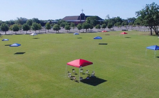 Multiple small tents are setup across the sports complex located at 1836 East Olive Road for people to come and pray. At noon, Pastor Ted Traylor will bring a prayer and a worded of encouragement on WEGS 91.7 FM.