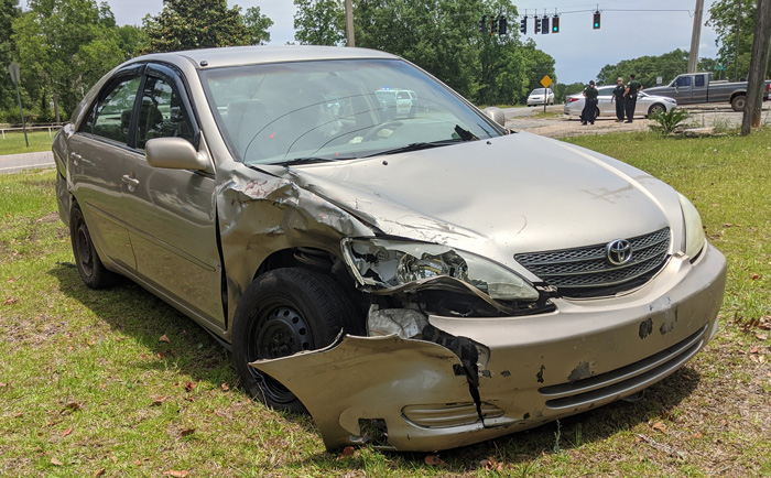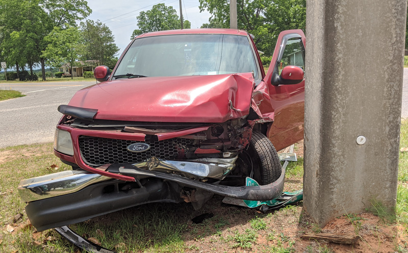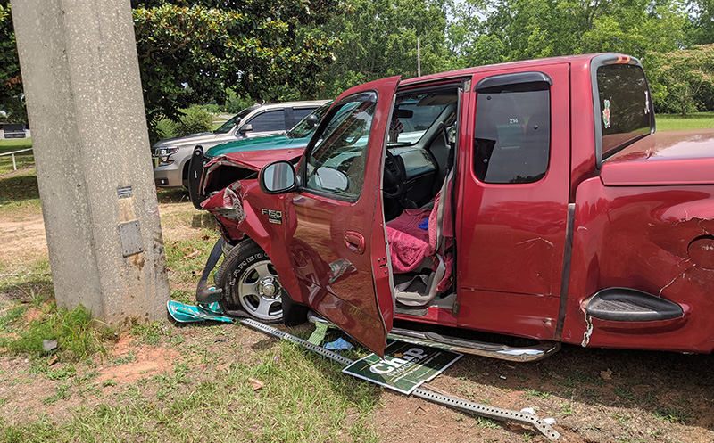 The crash happened about 11:20 a.m. at the intersection of West Highway 4 and Byrneville Road. A pickup truck and a passenger car collided, and the pickup truck hit a concrete traffic signal pole.