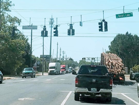Am oversize truck hauling a piece of equipment brought down lines on Becks Lake Road in Cantonment Monday morning and damaged several utility poles.