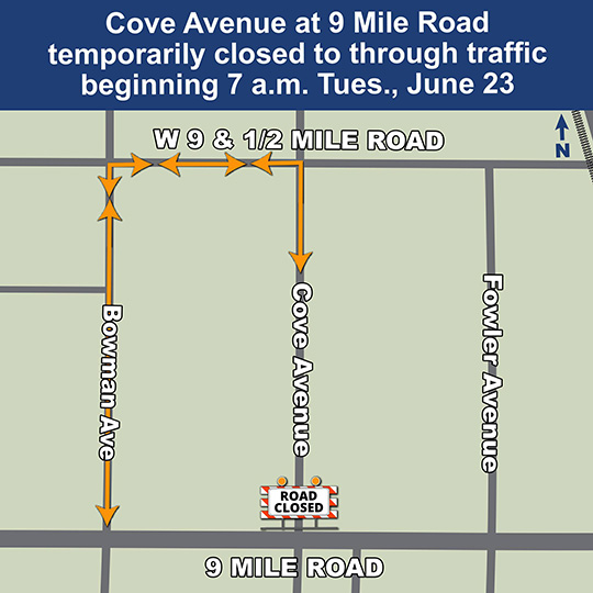 Cove Avenue north of Nine Mile Road will be closed to traffic at Tuesday, June 23. Drivers may use Nine & Half Mile Road and Bowman Avenue as an alternate route.