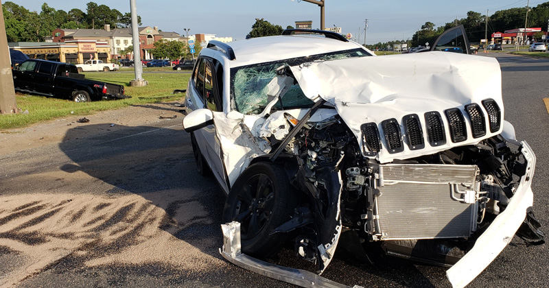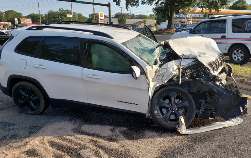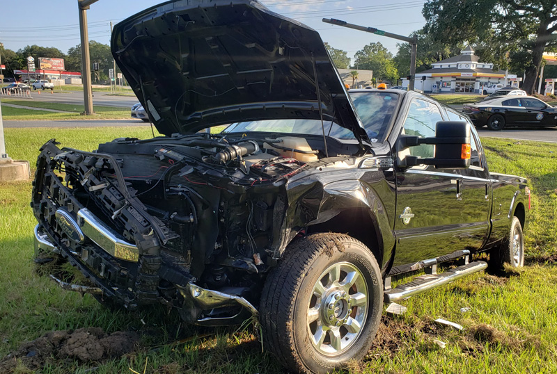 My husband and I were the ones in the truck. We were headed towards nine mile road. We had the green light at Wilde Lake Blvd. The person in the Jeep Cherokee pulled right out in front of us to get onto the east bound ramp of I-10. We were informed that the person admitted to not having their glasses on, so the person misjudged the turn. We were not speeding at all!! My husband ended up with a broken bone in his back and my right ankle is broke. We had a very hard time breathing for an entire week. We always wear our seatbelts. If we were not wearing them we could’ve been critically injured or killed. We had only a second before we noticed she was going to continue pulling right out im front of us. My husband had only enough time to slightly turn his steering wheel to the right. We ended up in the middle of two poles. I really thought we were about to die. We would’ve left our 5 children with no parents.