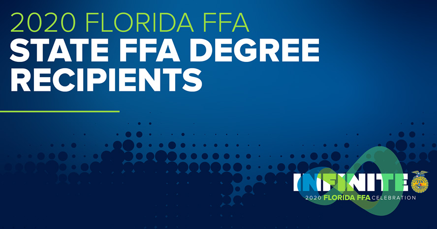 The State FFA Degree is the highest honor bestowed upon any regular member of the Florida FFA Association. Each applicant will be recognized during the 2020 Florida FFA Celebration.