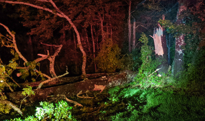The large tree split at the trunk and came crashing down completely across both lanes of Highway 99 at Bradberry Road in Bratt about 9:50 p.m. There were no injures when the vehicles hit the tree on the dark roadway.