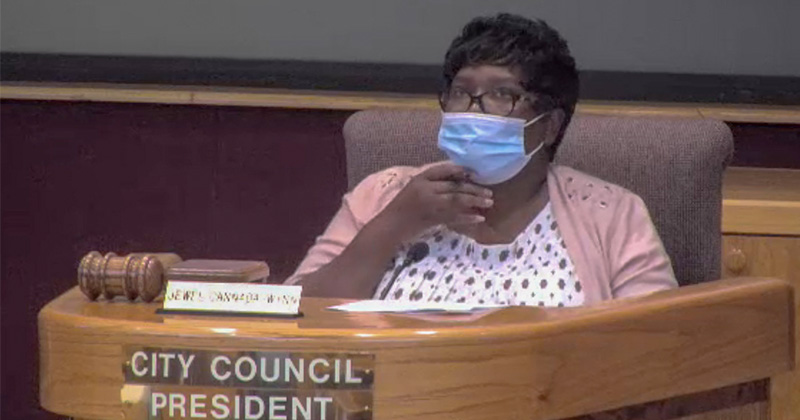 Pictured: Pensacola City Council President Jewel Cannada-Wynn (top) and Mayor Grover Robinson (below) at a special meeting of the council Tuesday night. Pictured second below: Councilman P.C. Wu participated by video, as did Sherri Myers. Pictured bottom: The public was not allowed to attend the meeting in person, only remotely.