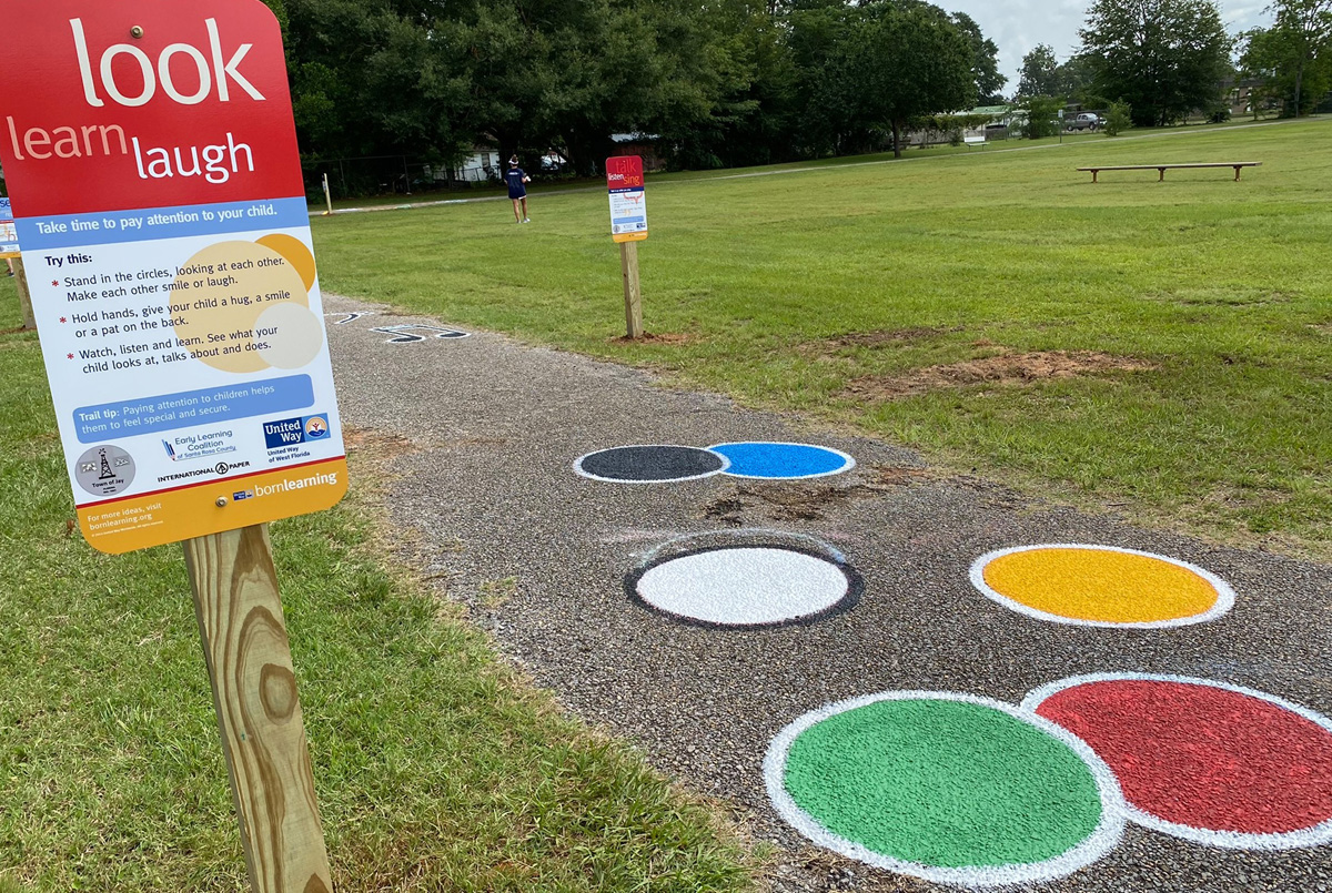 The Born Learning Trail, a United Way Worldwide initiative since 2005, is a series of 10 signs with activities painted on a park trail that offer fun, interactive learning activities for young children and their families. It helps parents, caregivers, and communities create quality engagement opportunities when out on a stroll or while playing at a park.