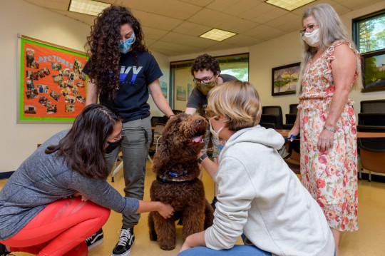 “I think with everything going on, with all the services and other ways to cope with stress limited due to COVID-19; Amos is a wonderful option for healing,” said Ismach-Eastman. “Although we offer in-person counseling, there is a major trend for most counseling to be virtual. While that option can certainly help, it only helps to an extent, especially since we were designed as social beings. The chaplains know all too well that touching screens more than hearts plays a detrimental toll on our mental and spiritual health. Amos meanwhile can offer something we can’t–namely a physical touch, a hug and the love and affection therapy dogs are known for.”
