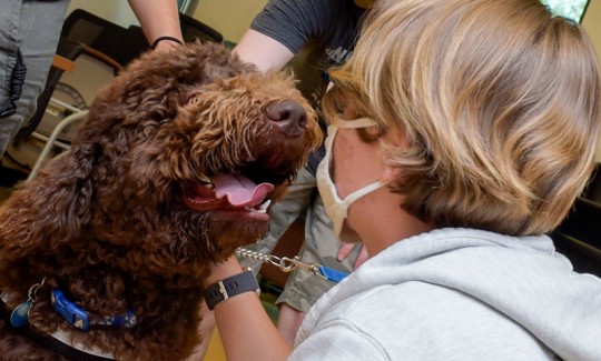Animal-assisted therapy is a therapeutic intervention that incorporates animals, such as horses, dogs, cats, pigs, and birds, into the treatment plan. It is used to enhance and complement the benefits of traditional therapy. The chaplains’ therapy dog is a Labradoodle named Amos.