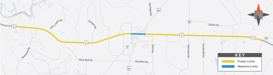 The projects spanned from the Escambia River Bridge to Market Road (Highway 87A) about 3.5 miles east of Jay. The project included milling and resurfacing the roadway, pedestrian safety improvements, guardrail upgrades at the Escambia River bridge, expansion joint replacement on the West Coldwater Creek bridge, and the replacement of the waterline from east of State Street to Magnolia Street in Jay.