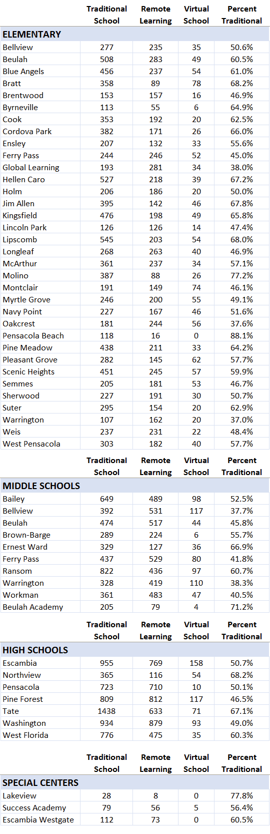 According to the latest data from the Escambia County School District provided by Superintendent Malcolm Thomas late Friday afternoon, 54.6% of students chose traditional school, 38.8% chose remote learning and 6.6% picked virtual school.