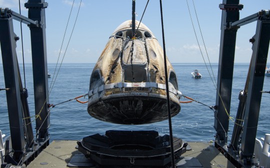Pictured above: The SpaceX Crew Dragon Endeavour spacecraft is lifted onto the SpaceX GO Navigator recovery ship shortly after it landed in the Gulf South of Pensacola.