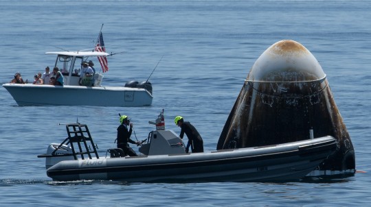 Pictured above: Support teams and curious recreational boaters arrive at the SpaceX Crew Dragon Endeavour spacecraft shortly after it landed south of Pensacola.