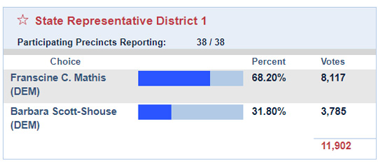In the Democratic primary, Mathis won with 68.20% of the vote to Barbara Schott-Shouse’s 31.80%.