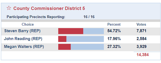 Barry received 54.72% of the vote. Political newcomer Megan Walters had 27.32%, and former commissioner John Reading received 17.96%. Barry returns to his seat with no Democratic opposition in November.