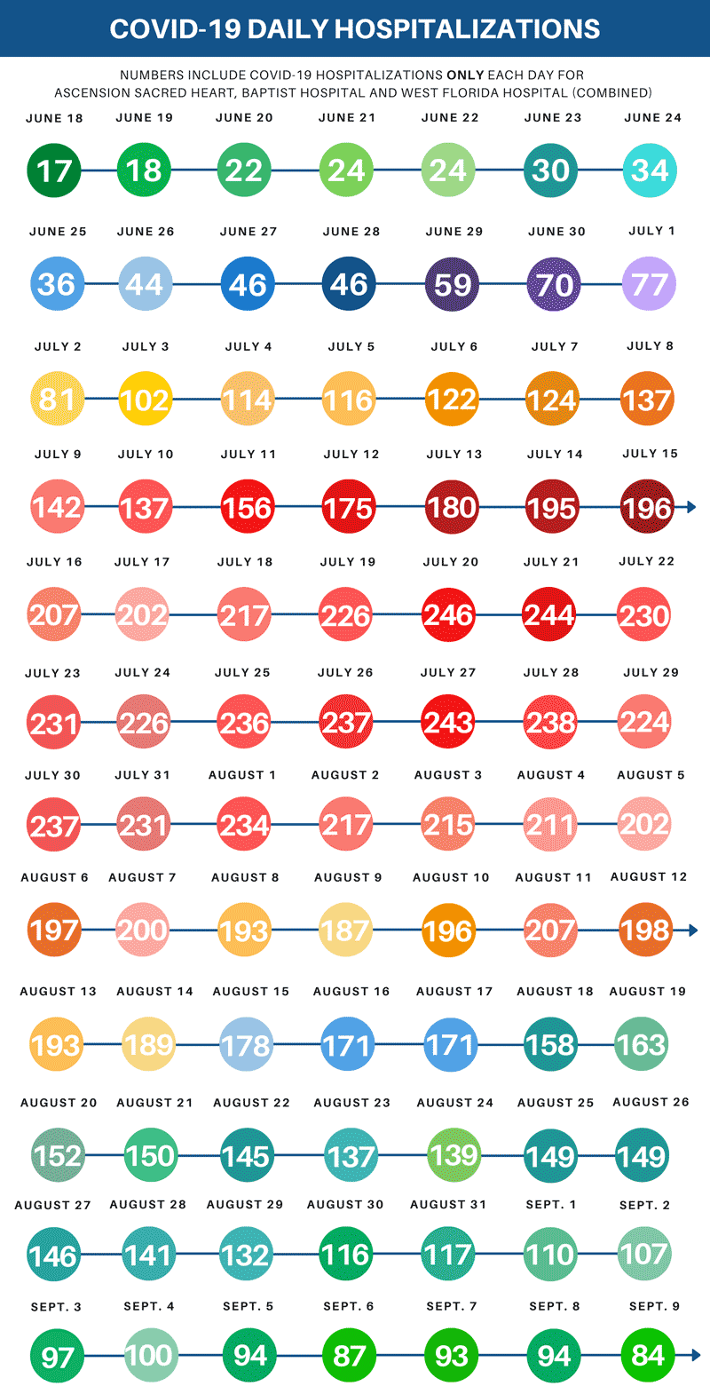 The number of COVID-19 hospitalizations in Escambia County are continuing to decline. As of Wednesday, there were 84 patients current hospitalized for COVID-19 in Escambia County, the lowest number since July 2.