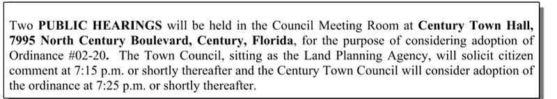 Pictured above: The red area shows the property at 220 East Pond Street. Pictured below: This published public notice did not indicate the date of the meeting. NorthEscambia.com graphics.