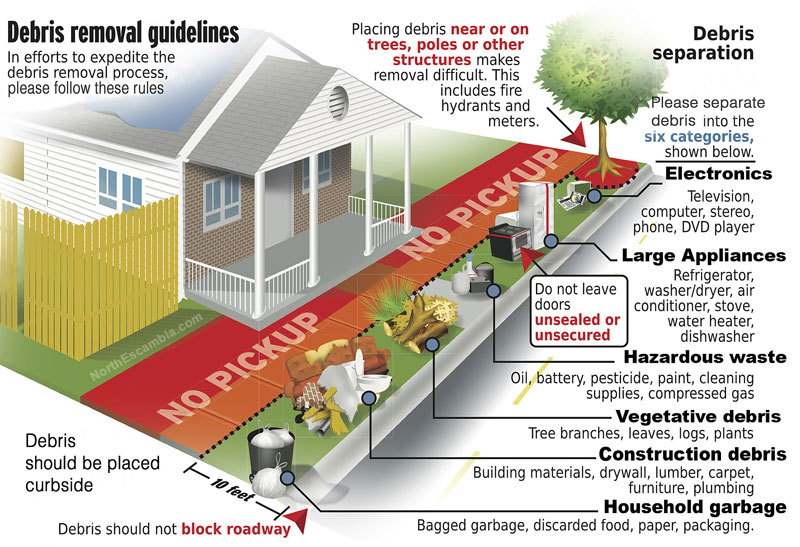 Escambia County residents, that can safely do so, are asked to place any storm-generated debris on the public right of way (the area of residential property that extends from the street to the sidewalk, ditch, utility pole or easement.)