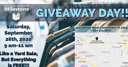 Saturday is Giveaway Day at the Church of Christ at Milestone from 9 a.m. until 11 p.m. Organizers say it is like a yard sale, but everything is free. The church is located at 4051 Stefani Road in Cantonment.