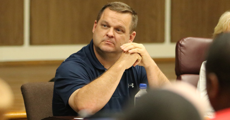 Pictured: Atmore council member Chris Harrison listens to a speaker during a council meeting. NorthEscamba.com file photo, click to enlarge.
