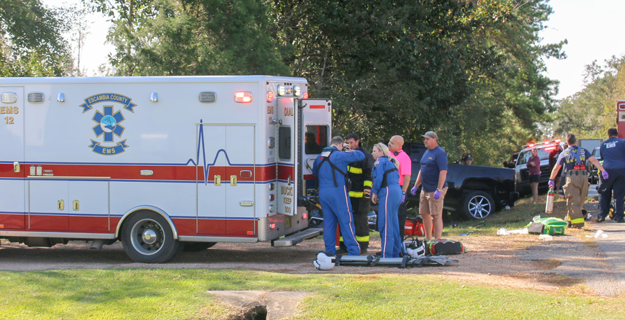 A 16-year old male passenger in the pickup truck was transported by Escambia County EMS to the hospital with minor injuries. The pickup driver was not injured.