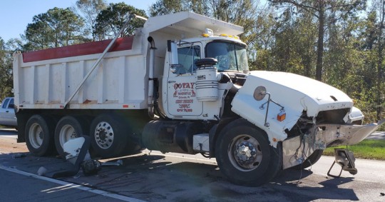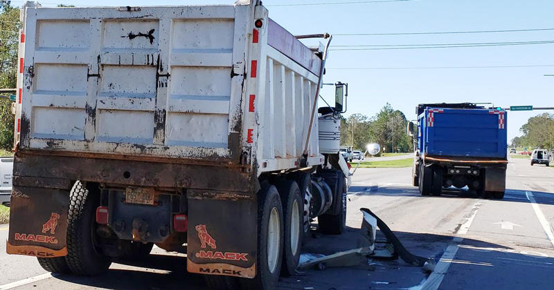 One dump truck rear-ended another on southbound Highway 29 at Old Chemstrand Road, and a third smaller truck was also involved.
