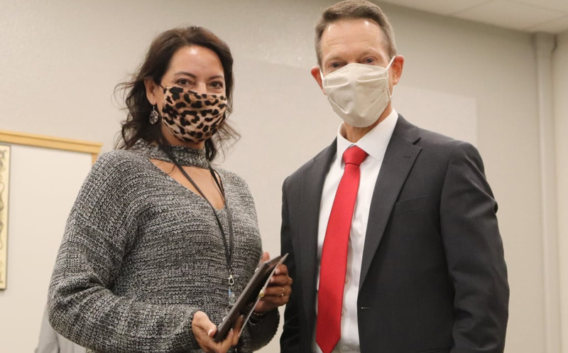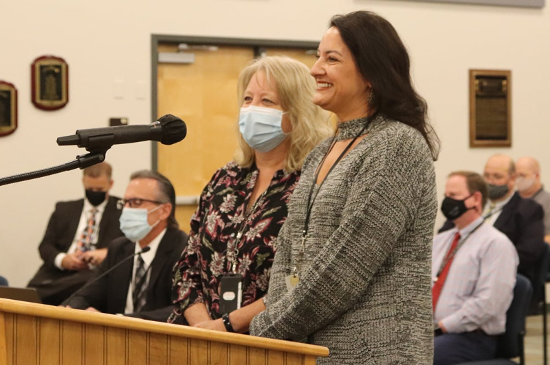 Emily Tullis of Bratt Elementary School was name the Escambia County School District’s Stellar Employee of the Month for November. Tullis is the data specialist at Bratt Elementary and has been with the school district for 16 years. She is pictured above with Superintendent Timothy Smith and below with Bratt Principal Karen Hall at an Escambia County School Board meeting. Photos for NorthEscambia.com, click to enlarge.