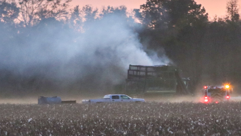 The smoldering cotton picker was located about a half mile off Morton Road in a field south of State Line Road. There were no injuries reported.