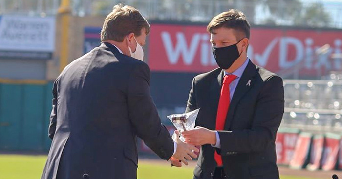 As Barry made his remarks, he looked up from the field at Blue Wahoos Stadium into the stands and saw his wife Ellen with their young son Jack.