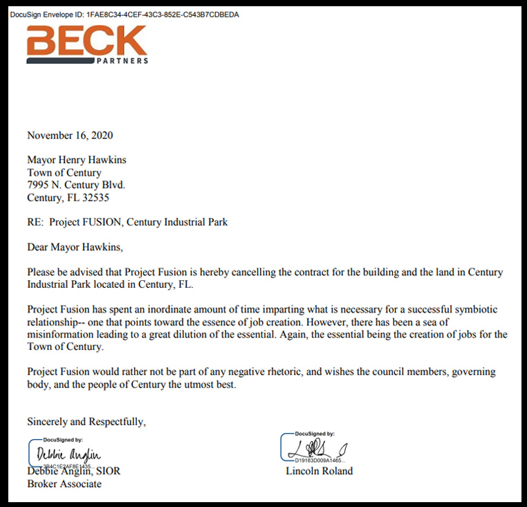 “Project Fusion has spent an inordinate amount of time imparting what is necessary for a successful symbiotic relationship– one that points toward the essence of job creation. However, there has been a sea of misinformation leading to a great dilution of the essential. Again, the essential being the creation of jobs for the Town of Century,” Debbie Aglin of the real estate firm Beck Partners and project investor Lincoln Roland wrote in a letter to Mayor Henry Hawkins. ” Project Fusion would rather not be part of any negative rhetoric, and wishes the council members, governing body, and the people of Century the utmost best.”