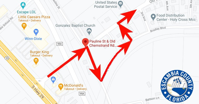 Old Chemstrand is closed between Pauline Street (near the railroad tracks) and 2nd Avenue (near the post office).