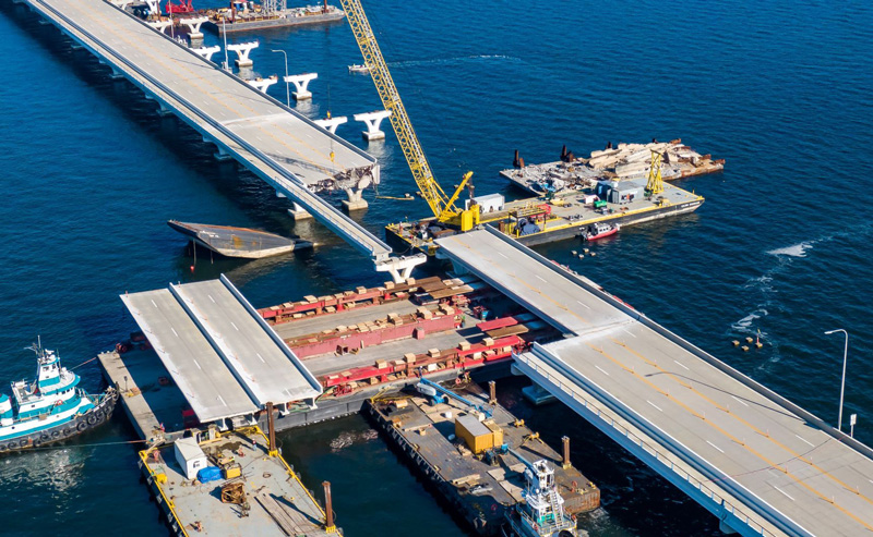 Large cranes mounted on barges are lifting the concrete piles into position where they are driven into the bay bottom using a 20,000-pound diesel-powered hammer. While there are no direct traffic impacts, persons nearby may detect noise and the possibility of vibration. Pile driving work will occur seven days a week and will not occur during overnight hours. Crews will also set the first set of beams, the horizontal supports for the bridge decks, beginning this week.