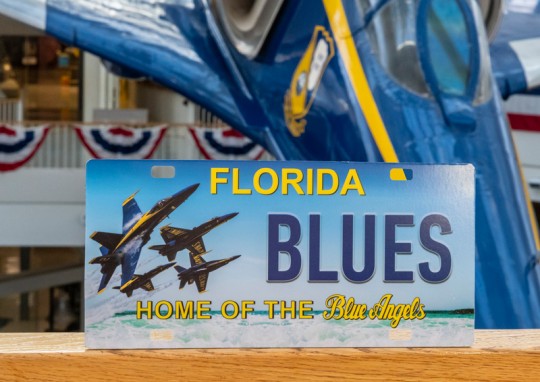 In September 2020, Governor Ron DeSantis signed a bill into law approving the Naval Aviation Museum Foundation’s Blue Angels specialty license plate. On October 1. he Escambia County Tax Collector, in partnership with the Naval Aviation Museum Foundation, began accepting online voucher orders to collect the 3,000 commitments needed for production to being.