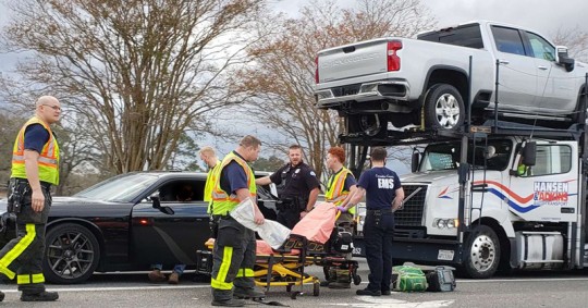 One person was injured when their vehicle was apparently rear-ended by a loaded truck hauling vehicles on Highway 29 near Muscogee Road Wednesday afternoon. The Florida Highway Patrol is investigating. NorthEscambia.com photo by Kristi Barbour, click to enlarge.