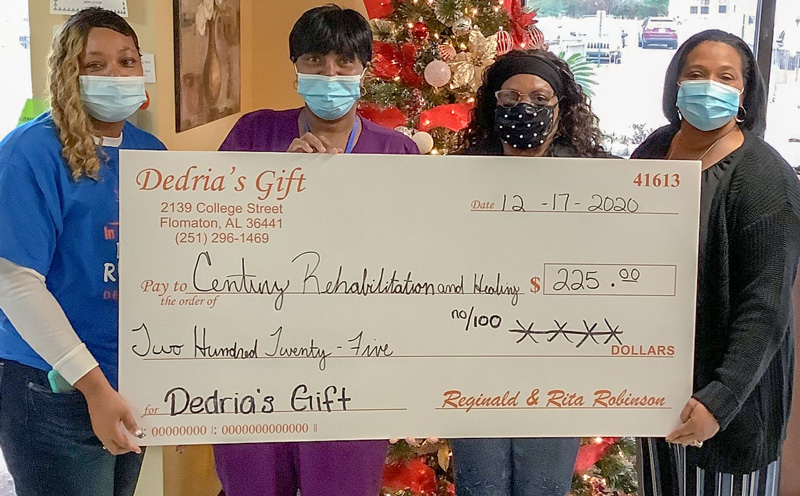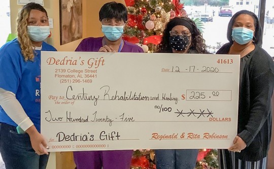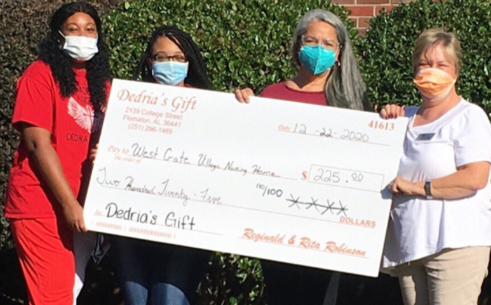 Dedria’s Gift, with help from St. Luke Missionary Baptist Church in Century, was able to make donations to two long term care facilities for residents to use at Christmas.
