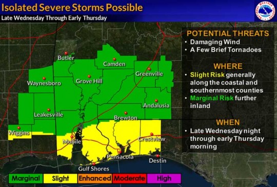There is a chance of severe weather with a passing cold front late tonight into early Thursday morning. The biggest threats are damaging wind and a few brief tornadoes.