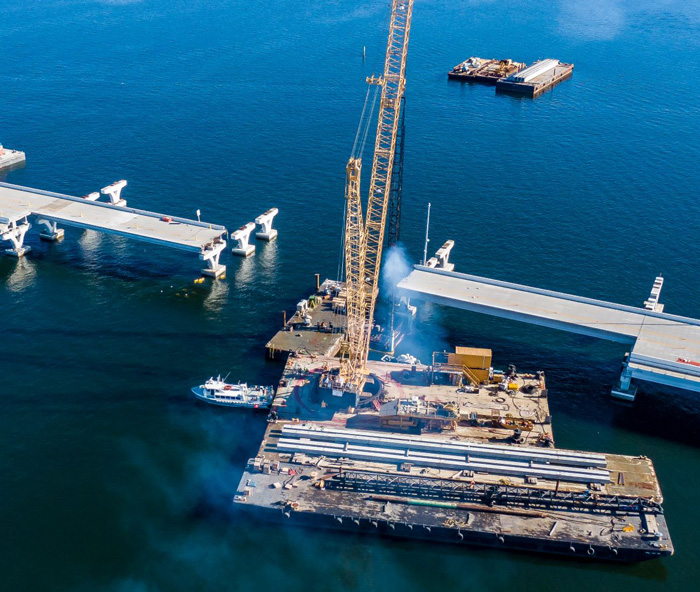An additional piling driving crew has been added to ensure pile driving efforts remain on schedule. These crews are tasked with moving the pile driving template, working on pier removal, clearing the bottom of the bay from any debris, and driving piles into the bay floor utilizing a 20,000-pound diesel-powered hammer.