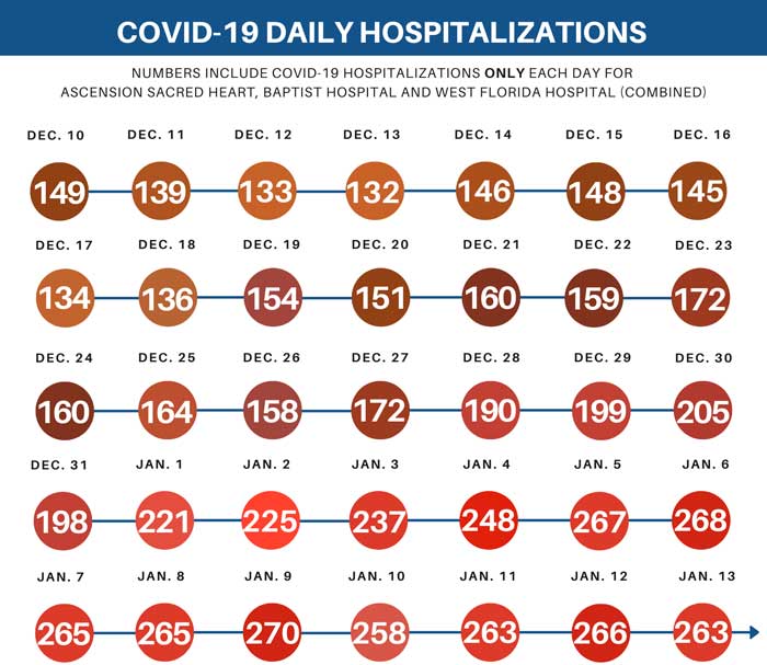 There were 263 people currently hospitalized in Escambia County on Wednesday, down slightly from a record 270 on Saturday, January 9. During a summer surge, local COVID-19 hospitalizations reached a peak of 246 on July 20.
