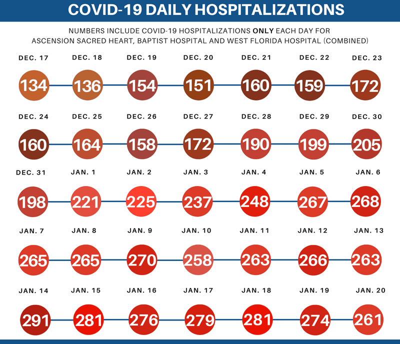 The numbers in the graph indicate daily hospitalizations in Escambia County and are provided daily by Ascension Sacred Heart Hospital, Baptist Hospital and West Florida Hospital. The daily numbers are not cumulative.