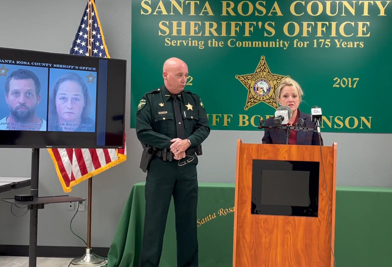 Pictured below: Santa Rosa County Sheriff Bob Johnson listens as Stat Attorney Ginger Bowden Madden speaks about the arrests of Brandi Nacole Harper and her boyfriend, John David McKenzie, during a press conference Tuesday morning. Photo for NorthEscambia.com, click to enlarge.