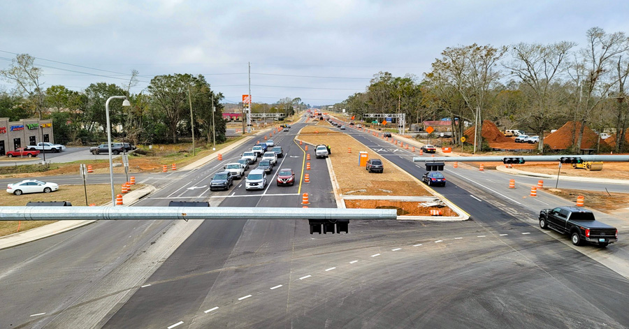 Pictured: The new traffic patterns on Nine Mile Road to the east of the Highway 29 overpass (above) and to the west (below). Photos for NorthEscambia.com, click to enlarge.