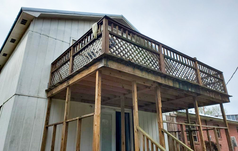 An adult and child had been sleeping upstairs and were alerted by an alarm system. They were unable to go downstairs due to smoke and fire, and smoke had forced them outside onto the back deck of the second story.