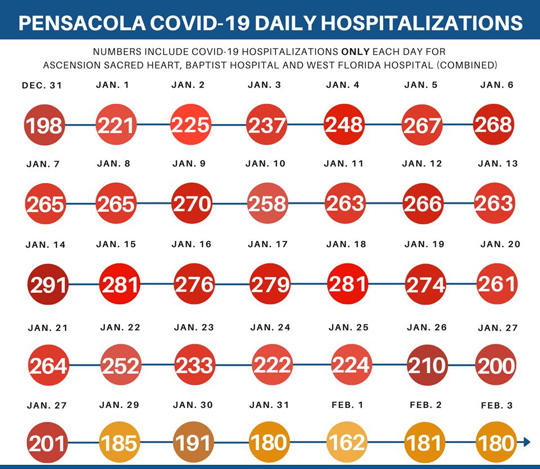 “COVID-19 hospitalizations between the three local hospital systems are starting to slowly go down, but we still want to get back to the 50-75 range,” Pensacola Mayor Grover Robinson said. “It’s important that we continue to work together to bring these numbers down for our community and for our hospitals. Please be vigilant and take preventative actions, including wearing a mask, social distancing and washing your hands often.”