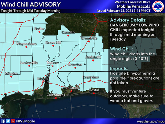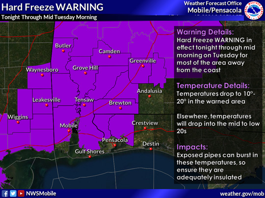 There is a hard freeze warning in effect for tonight across the area. There is also a wind chill advisory for wind chills Tuesday morning between 0 and 10 degrees.